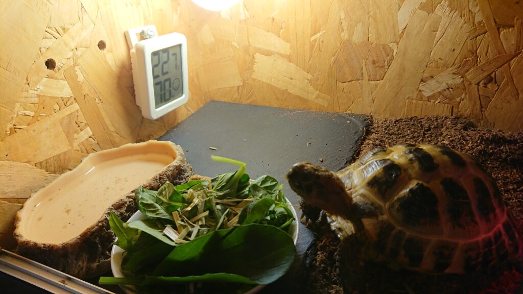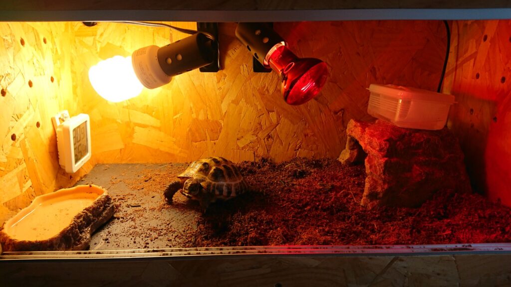 ロシアリクガメは比較的寒い地域にも分布していて、ある程度の耐寒性があるので多少の寒さよりも加温することによる過度な乾燥の方が心配なのでできるだけ加温はしないようにしています。